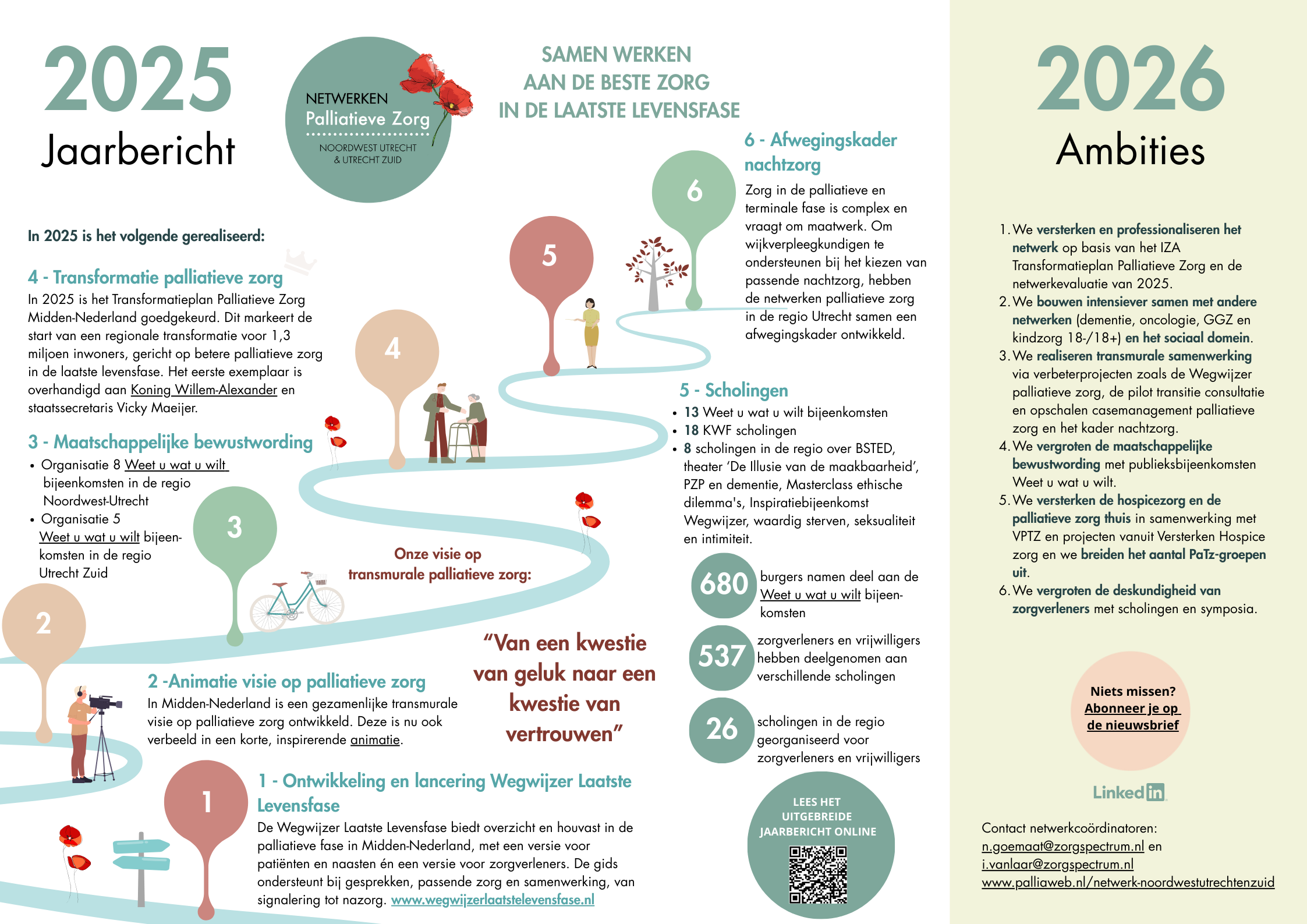 Met trots presenteren we het Jaarbericht 2025 én onze ambities voor 2026. De netwerken palliatieve zorg Noordwest-Utrecht en Utrecht-Zuid zetten zich samen met partners in de SEPTET-regio Midden-Nederland in voor goede zorg in de laatste levensfase. In 2025 werkten we aan betere samenwerking, meer bewustwording en ondersteuning voor zorgverleners, patiënten en naasten.