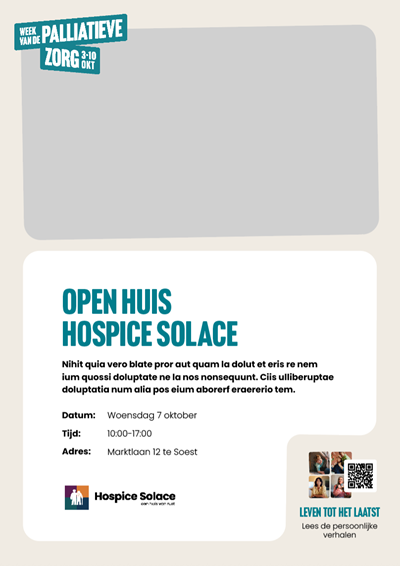 Heb je geen mogelijkheden om het sjabloon te vullen met een eigen foto, logo en tekst? Dan is er de opmaakservice. Voor een beperk aantal initiatieven bieden we de mogelijkheid om de opmaak te verzorgen. Maximaal één activiteit per organisatie/initiatief. Neem contact op met info@weekvandepalliatievezorg.nl en informeer naar de mogelijkheden.