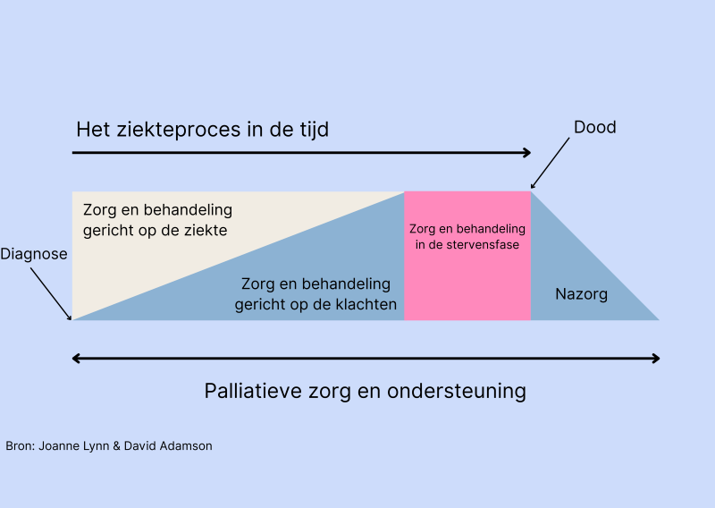 De palliatieve fase begint wanneer genezing niet meer mogelijk is of wanneer het levenseinde door kwetsbaarheid in zicht komt. Palliatieve zorg kan dan ingezet worden, ook naast ziektegerichte behandeling.